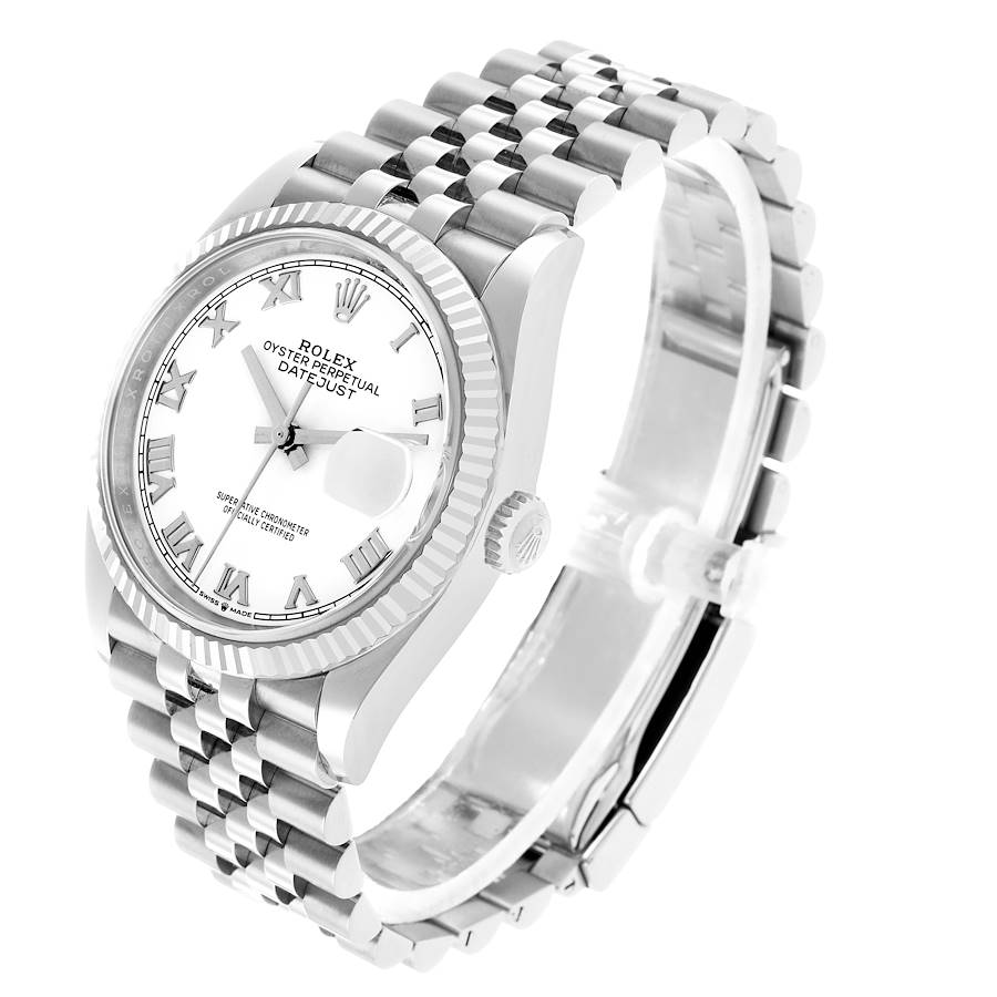 Replica Rolex Datejust Steel White Gold Roman Dial Mens Watch 126234. Officially certified chronometer automatic self-winding movement. Stainless steel oyster case 36.0 mm in diameter. Rolex logo on the crown. 18K white gold fluted bezel. Scratch resistant sapphire crystal with a cyclops magnifier. White dial with raised white gold Roman numeral hour markers and baton hands. Date calendar at the 3 o'clock aperture. Stainless steel jubilee bracelet with an oysterlock clasp. Fits a 7 1/4" wrist.
